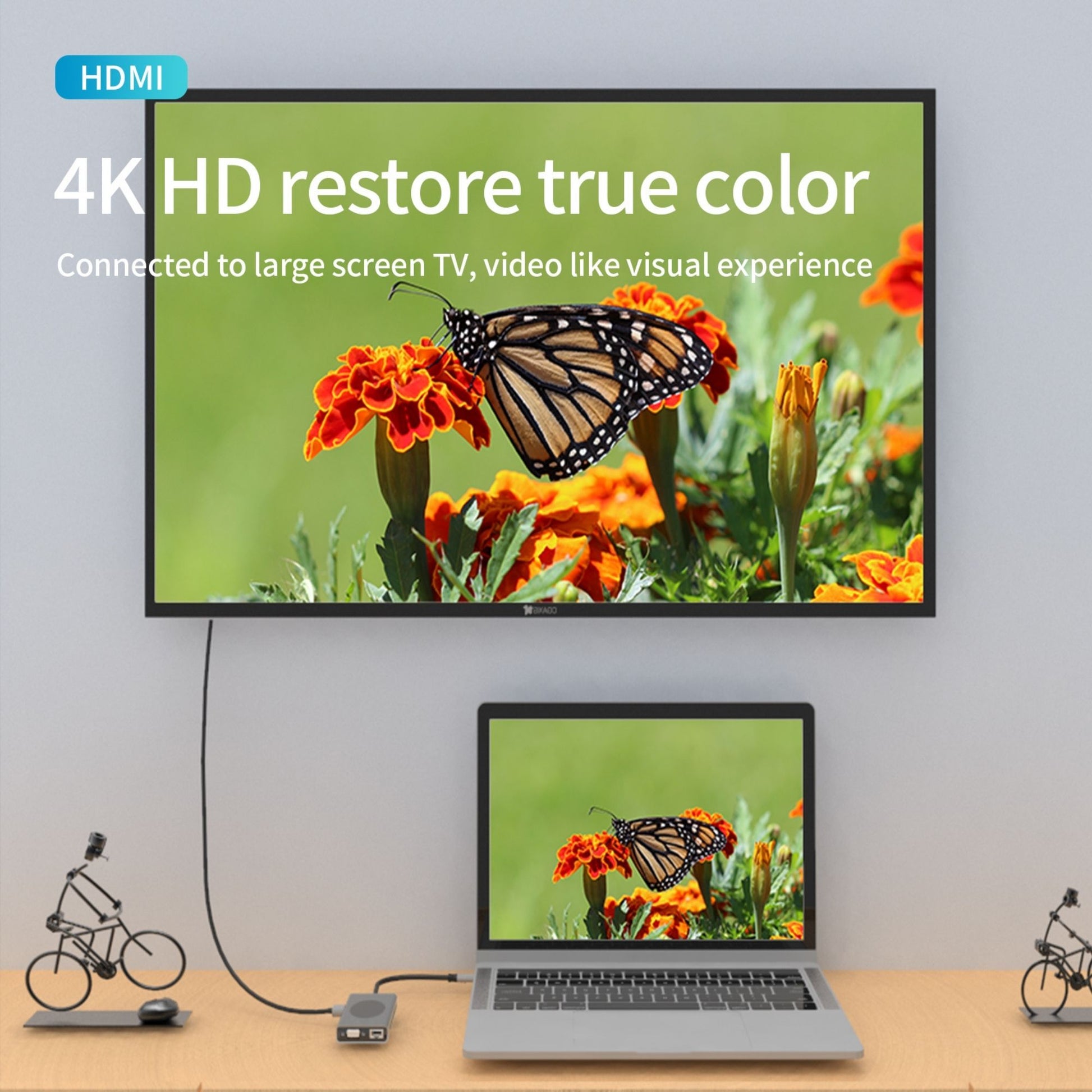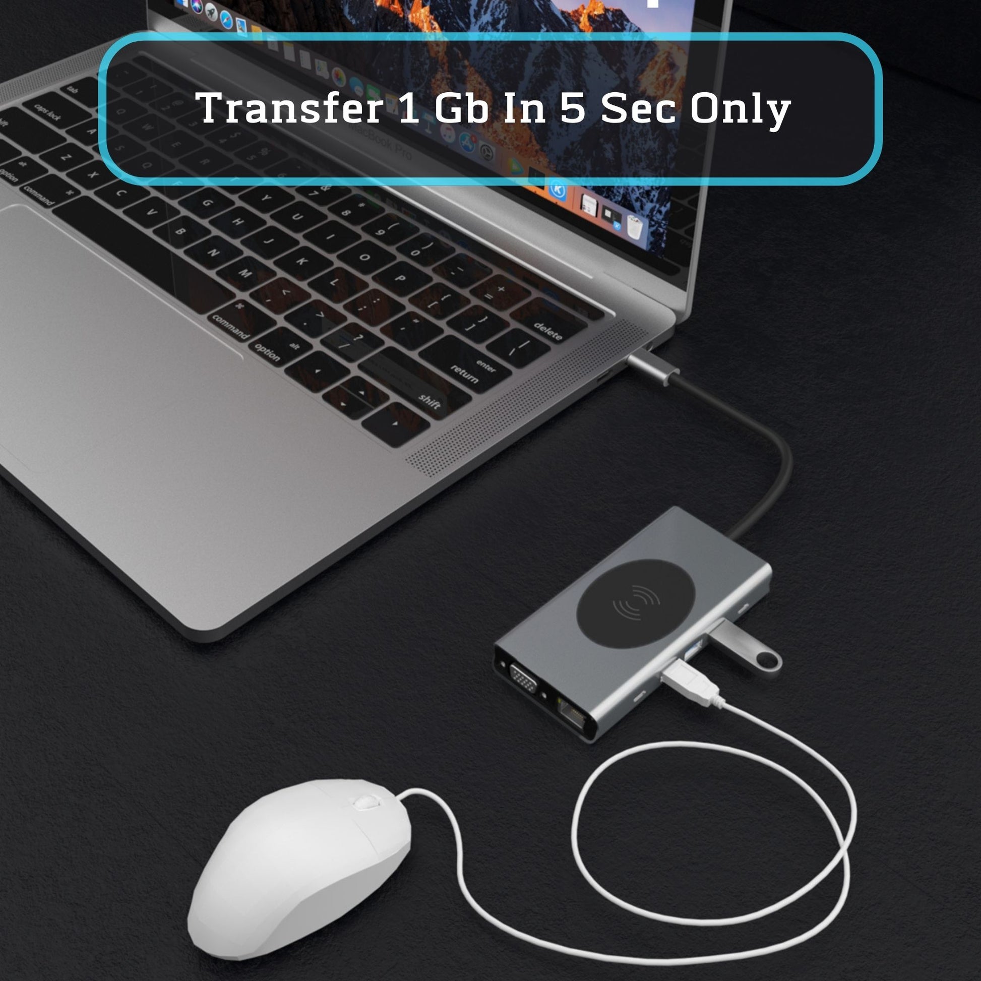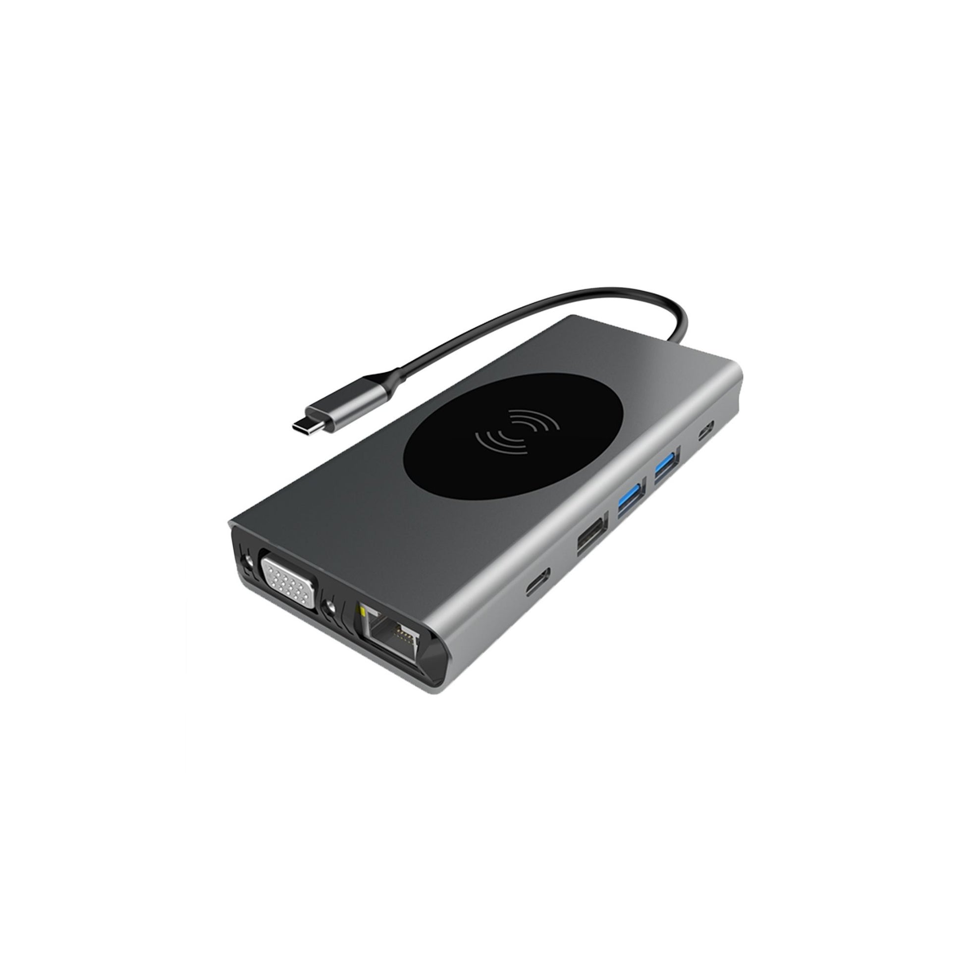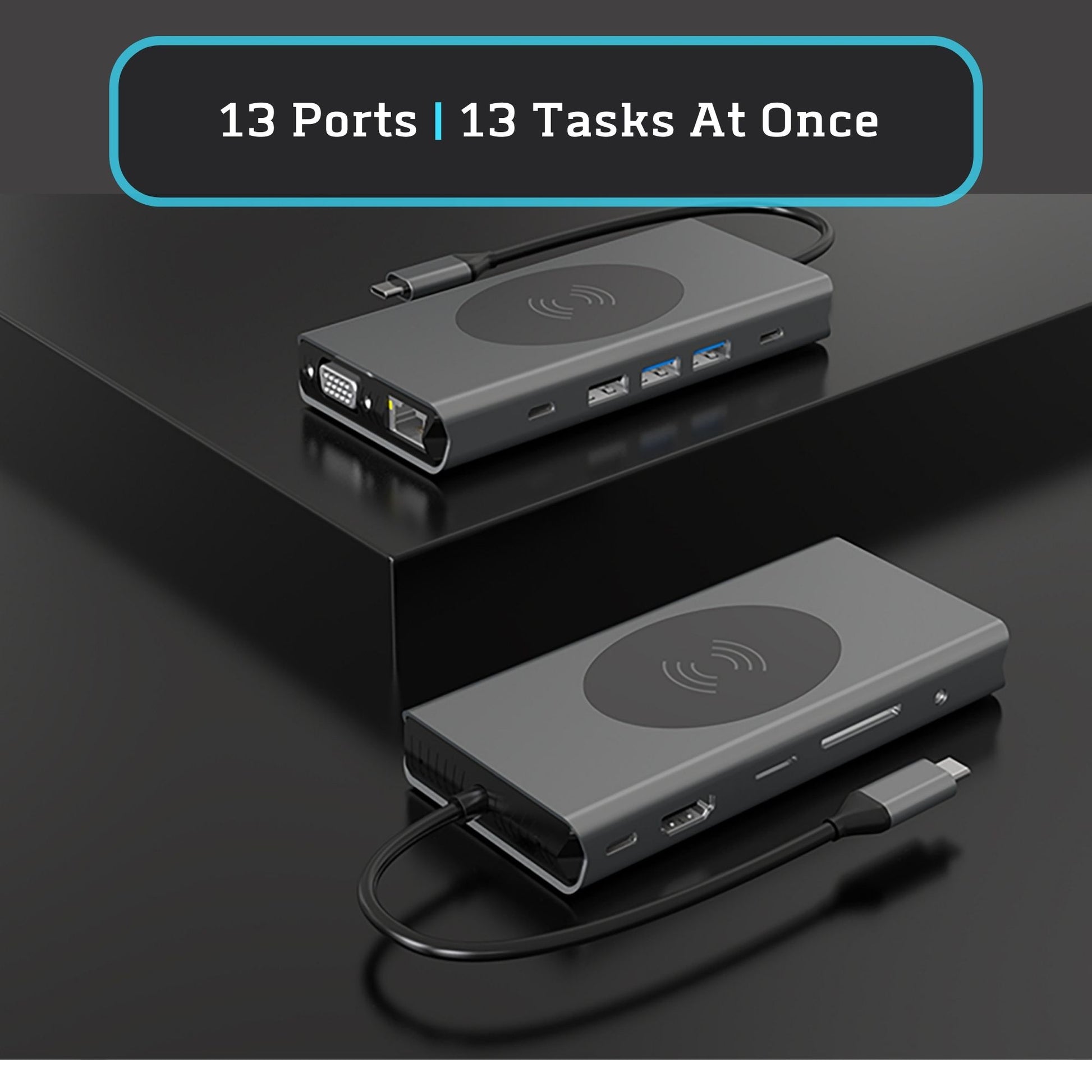 - 13 in 1 Docking Station Ports: Fast Wireless Charging Body (15W), HDMI (4k), VGA(1080), USB3.0x 5, Memory Card, Storage Card, RJ45 (Ethernet network port), PD (100W Power Delivery), Audio 3.5mm.