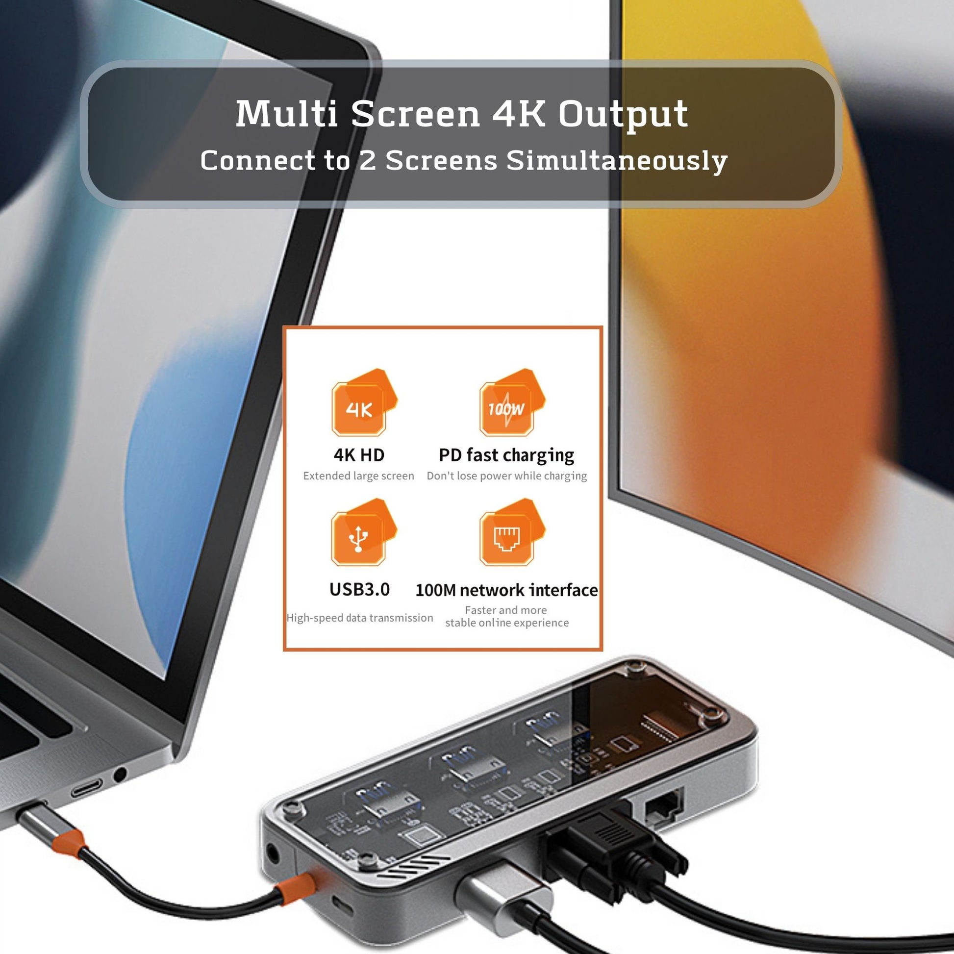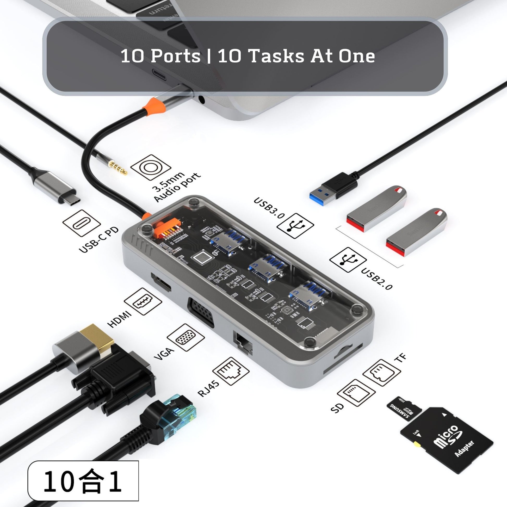 - 10 in 1 Docking Station Ports: USB-C (Power Delivery and Data Transfer), USB-A 3.0 (5 Gbps Data Transfer), HDMI (4K Video Output), VGA (Video Output), Ethernet (RJ-45), Port (Wired Network Connectivity), SD Card Slot (Secure Digital Card Access), Audio Port (3.5mm Jack), 2 X USB-A 2.0 (Data Transfer)